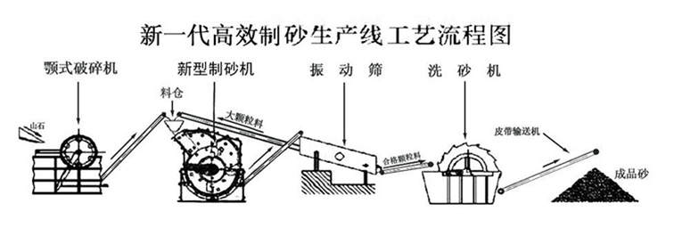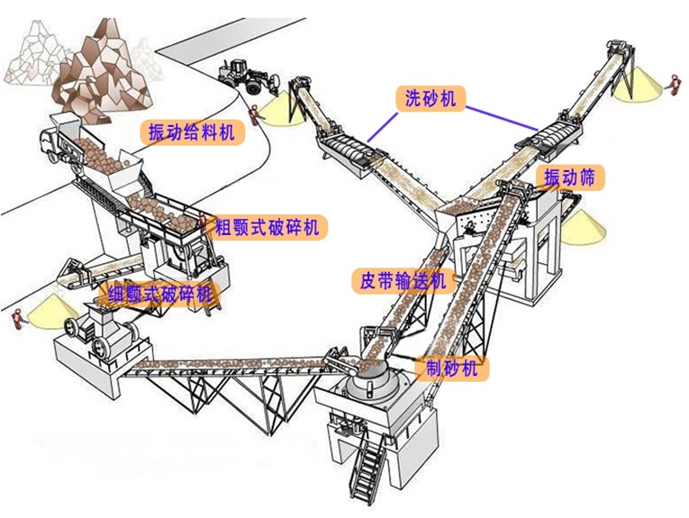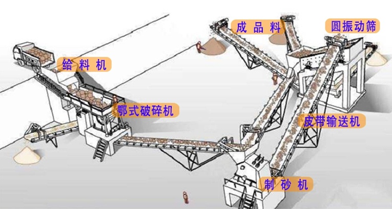 石料通過(guò)振動(dòng)給料機(jī)均勻進(jìn)入粗顎式破碎機(jī)進(jìn)行初步破碎,產(chǎn)成的粗料由輸送機(jī)輸送至細(xì)碎機(jī)(可選配重型制砂機(jī)或立軸制砂機(jī))進(jìn)行進(jìn)第二步破碎,細(xì)碎后的石料進(jìn)振動(dòng)篩篩分出各種規(guī)格的沙子、石子;然后進(jìn)入振動(dòng)篩進(jìn)行篩分,滿足客戶要求的通過(guò)輸送機(jī)輸送至成品料區(qū),不滿足要求的重新進(jìn)入制砂機(jī)再次破碎,終產(chǎn)出符合要求的各種砂料(人工沙生產(chǎn)線)。