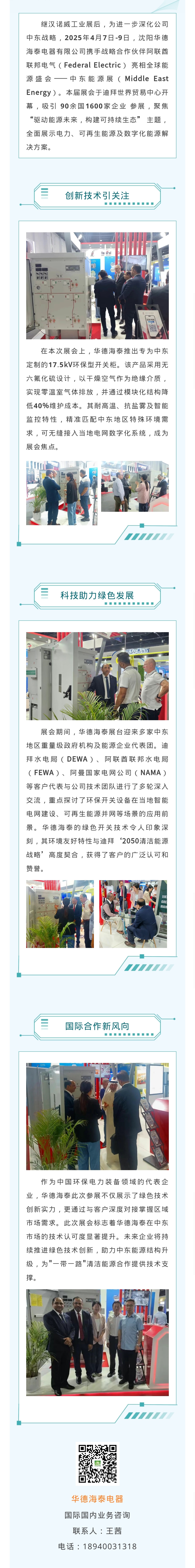 【概要描述】繼漢諾威工業(yè)展后,為進(jìn)一步深化公司中東戰(zhàn)略,2025年4月7日-9日,沈陽(yáng)華德海泰電器有限公司攜手戰(zhàn)略合作伙伴阿聯(lián)酋聯(lián)邦電氣(Federal Electric) 亮相全球能源盛會(huì)——中東能源展(Middle East Energy)。本屆展會(huì)于迪拜世界貿(mào)易中心開幕,吸引 90余國(guó)1600家企業(yè) 參展,聚焦 “驅(qū)動(dòng)能源未來,構(gòu)建可持續(xù)生態(tài)” 主題,全面展示電力、可再生能源及數(shù)字化能源解決方案。